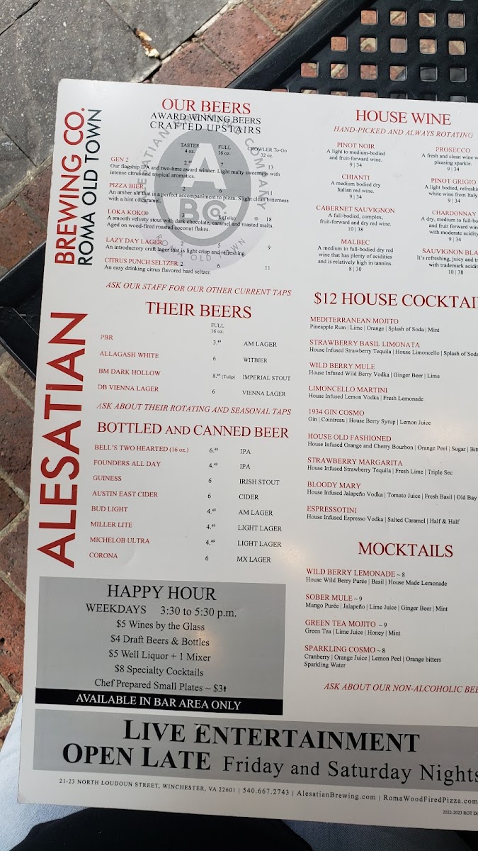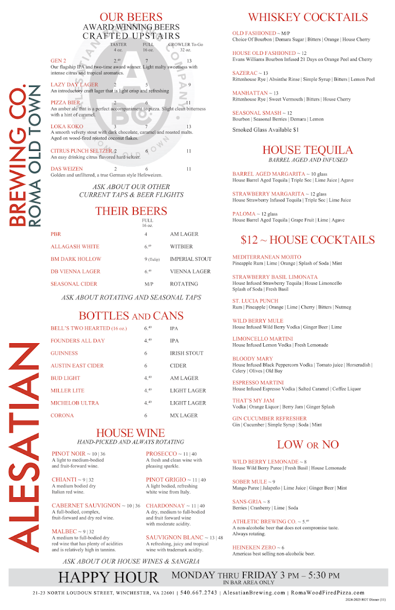 This menu fits smoothly into the easy pace and friendly vibe of the pizzeria and brewpub setting, ideal for moments spent catching up with friends or unwinding after a day of exploring Old Town Winchester. Whether you’re in the mood for comforting wood-fired flavors or a refreshing drink, the range here supports a genuine, relaxed dining experience without fuss.
